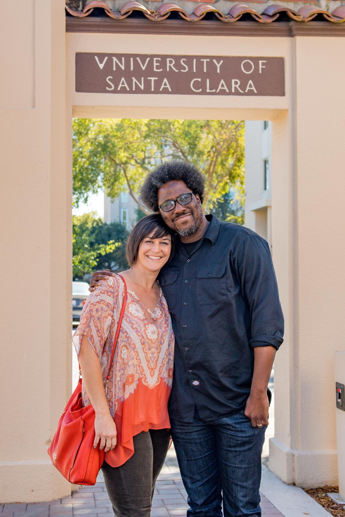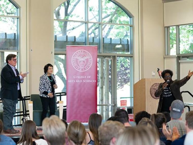 W. Kamau Bell completed his visits to campus on May 24, 2018, and left a legacy of reflection, learning, understanding of how to build empathy and reconciliation through dialogue and yes, humor. The Emmy-winning stand-up comedian, author, and CNN host offered incisive and scathingly funny commentary on modern society that helped change views on race, politics, identity and social issues in the United States. Joined by his spouse, Dr. Melissa Bell, SCU '01, Sinatra Faculty Fellow Danielle Morgan, Sinatra Student Fellow Julia Joyce and comics, academics, and thought-provoking guests, Mr. Bell visited classes, offer workshops for students, faculty, and staff, and entertained and informed the campus and Silicon Valley community.