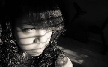 A young girl with long dark hair n a darkened room staring out a window. The shadows from the window blinds are seen across her face. "Depression please cut to the chase." by darcyadelaide is marked with CC BY 2.0.